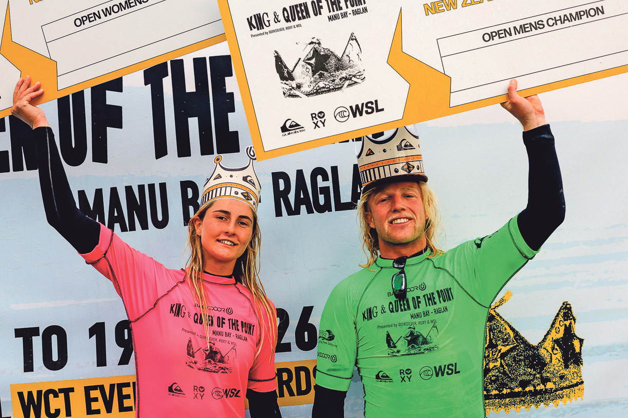 The Backdoor King and Queen of the Point drew a strong local turnout, both in the water and on the Manu Bay hillside, with added interest this year as the event offered wildcard spots into the Championship Tour.